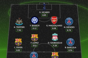 中場:亞馬爾(巴薩,8.82分)、費爾明(巴薩,10分)、索博斯洛伊(利物浦,9.28分)、巴爾科拉(巴黎,8.96分)