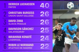 體育資訊10月23日訊 本賽季歐冠聯(lián)賽階段已戰(zhàn)罷3輪,Squawka統(tǒng)計了到目前為止的解圍榜單。帕福斯后衛(wèi)盧卡森40次解圍斷崖式領(lǐng)先,圣吉羅斯后衛(wèi)布爾格斯和布拉格斯拉維亞后衛(wèi)齊瑪26次分列二三位。