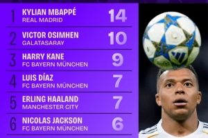 本賽季歐冠射正榜:姆巴佩14次第一,奧斯梅恩10次第二凱恩第三