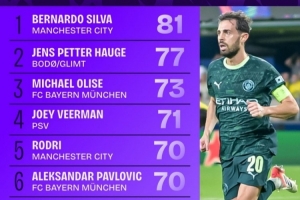 本賽季歐冠完成進攻三區(qū)傳球榜:B席81次第一,曼城4人上榜