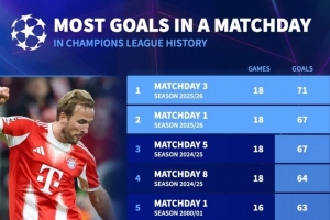 體育資訊10月23日訊 德國轉(zhuǎn)會(huì)市場(chǎng)統(tǒng)計(jì)了歐冠單輪比賽進(jìn)球數(shù)量,并列出歐冠歷史單一輪次進(jìn)球排名,本輪歐冠打進(jìn)71球居首。