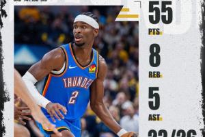 本場比賽,雷霆當(dāng)家球星亞歷山大一展雙MVP風(fēng)采,攻防俱佳,戰(zhàn)力十足,末節(jié)&加時頻頻取分,砍下生涯新高的55分&罰球數(shù)生涯新高26記,同時成為本賽季全聯(lián)盟首位50分先生!