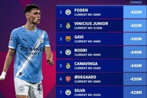 2025年身價(jià)跌幅榜:福登-6000萬(wàn)歐居首,維尼修斯-5000萬(wàn)歐次席