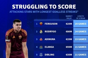 體育資訊10月25日訊 德國轉(zhuǎn)會市場盤點了進攻球員進球荒場次,并列出榜單,埃文-弗格森25場,羅德里戈24場。