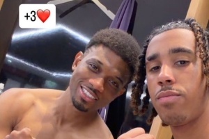 約羅也在賽后通過(guò)社媒曬出自己和阿瑪?shù)略谫惡蟾率页嗦闵习肷淼淖耘恼?,兩人看起?lái)都相當(dāng)開心,約羅還配文道:“+3分”。