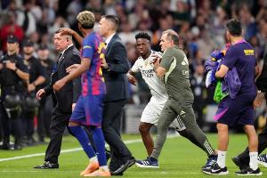 亞馬爾走近場邊時(shí),維尼修斯走過來對他做了“話太多”的手勢,兩人發(fā)生爭吵?;蜀R門將教練略比斯試圖將維尼修斯拖回球員通道,但這位巴西人開始沖向亞馬爾,被皇馬四名工作人員攔住。拉菲尼亞跑向國家隊(duì)隊(duì)友維尼修斯,被皇馬的巴爾韋德及時(shí)制止。