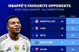體育資訊10月27日訊 皇馬在本輪西甲焦點戰(zhàn)2-1力克巴薩,姆巴佩取得進球?!掇D(zhuǎn)會市場》統(tǒng)計顯示,巴薩也是姆巴佩生涯各項賽事進球第4多的對手。