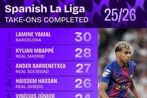 體育資訊10月29日訊 Squawka統(tǒng)計(jì)了本賽季球員在西甲的成功過人次數(shù),并列出榜單,亞馬爾、姆巴佩排名前兩位。