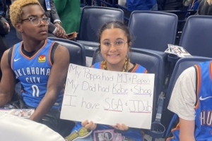 這位雷霆球迷手舉手寫牌,上面寫道:“我的爺爺有喬丹和皮蓬,我的爸爸有科比和奧尼爾,而我有亞歷山大和杰倫-威廉姆斯。”