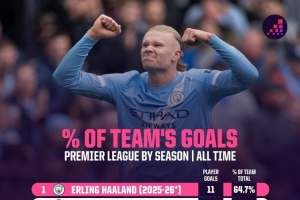 體育資訊10月31日訊 Opta統(tǒng)計了球員單賽季英超進(jìn)球在球隊(duì)的占比,并列出榜單,本賽季哈蘭德占比64.7%最高。
