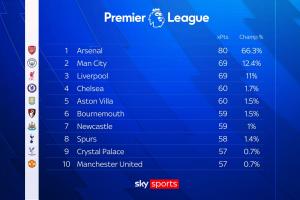 天空預(yù)測:阿森納本賽季80分問鼎英超,最低70分即可奪冠或創(chuàng)新低