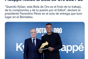 在這里,你正穿著你如此渴望的白色球衣,書寫著你自己的歷史。我們的球迷崇拜你,并將在每一次挑戰(zhàn)中陪伴你。親愛的姆巴佩,這座金靴獎對你來說是繼續(xù)贏下去、繼續(xù)為皇家馬德里的偉大歷史做出貢獻(xiàn)的又一動力。