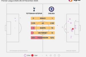 體育資訊11月2日訊 英超第10輪比賽,熱刺在主場以0-1的比分不敵切爾西。本場比賽,熱刺的預(yù)期進(jìn)球數(shù)僅為0.05。