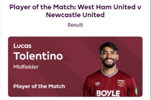 體育資訊11月3日訊 英超第10輪西漢姆聯主場3-1擊敗紐卡,據賽后英超官方消息,帕奎塔被評為此役全場最佳球員,獲43%的投票。