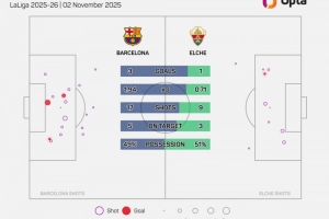 據(jù)OptaJose的數(shù)據(jù)統(tǒng)計(jì),埃爾切是自2005-06賽季以來(lái),首支在西甲聯(lián)賽中對(duì)陣巴薩時(shí),控球率高于對(duì)手的升班馬球隊(duì)。