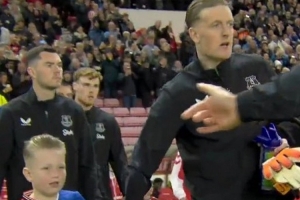 此役皮克福德?lián)伟8ヮD首發(fā)門將,他的兒子身穿桑德蘭和埃弗頓的拼接球衣入場。