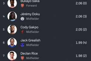 本賽季英超預期助攻排名(括號內(nèi)為實際助攻):