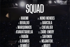 前鋒:7-克瓦拉茨赫利亞、9-貢薩洛-拉莫斯、10-登貝萊、19-李剛仁、29-巴爾科拉、47-恩賈恩圖、49-姆巴耶