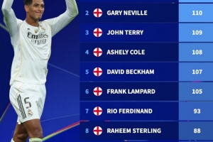 體育資訊11月5日訊 在本輪歐冠,利物浦1-0擊敗皇馬。貝林厄姆完成生涯50場歐冠里程碑,德轉(zhuǎn)也盤點(diǎn)了英格蘭球員歐冠出場次數(shù)榜,具體如下:
