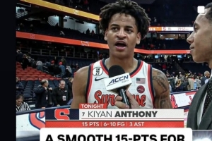 體育資訊11月5日訊 在昨天的一場(chǎng)NCAA比賽中,雪城大學(xué)85-47大勝賓漢頓大學(xué)??仿 ぐ矕|尼之子基揚(yáng)·安東尼完成了大學(xué)正式比賽的首秀。
