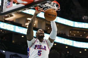 76人內(nèi)線德拉蒙德上半場(chǎng)替補(bǔ)出戰(zhàn)表現(xiàn)出色,不僅是前場(chǎng)籃板搶得很兇,籃下終結(jié)也很高效。