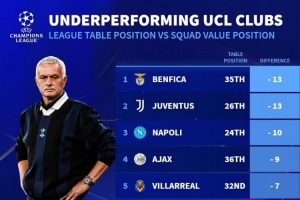 體育資訊11月6日訊 德國轉(zhuǎn)會市場根據(jù)球隊目前歐冠排名與陣容身價排名的差距,列出了本賽季歐冠表現(xiàn)不佳球隊榜,本菲卡、尤文最差。