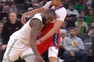 發(fā)際線粉事件之一:對陣奇才時杰倫·布朗發(fā)際線粉粘到對手白T上