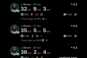 過去5場(chǎng)比賽,布朗四次砍下30+,賽季至今,他場(chǎng)均砍下28.1分。