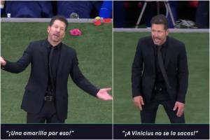 在一次犯規(guī)判罰之后,鏡頭拍到了馬競(jìng)主帥西蒙尼正在對(duì)主裁曼薩諾抗議:“嘿!你在吹什么!冷靜點(diǎn)!就為了這個(gè)出牌?”西蒙尼最后又搖著頭說(shuō):“你不敢對(duì)維尼修斯出牌?!比缓笏侄⒅谒墓賳T重復(fù)了一遍這句話。