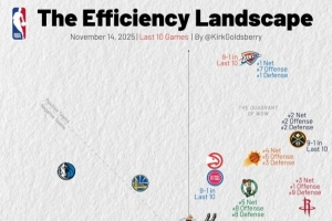 橫軸代表進(jìn)攻效率,越靠右越好,縱軸代表防守效率,越靠上越強(qiáng)。第一象限的球隊(duì)多為發(fā)揮出色的球隊(duì),而在第三象限的球隊(duì)通常為戰(zhàn)績(jī)比較糟糕的球隊(duì)。