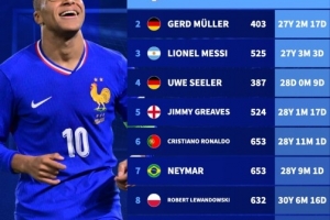 1、姆巴佩(537場(chǎng)):26歲10個(gè)月24天