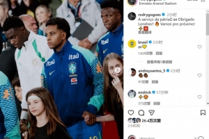 此役羅德里戈為巴西隊首發(fā)出戰(zhàn),定位球助攻卡塞米羅破門,賽后羅德里戈社媒曬照慶祝勝利,配文:“為國出戰(zhàn),感謝倫敦!專注于下一場比賽!”