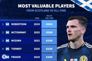 體育資訊11月16日訊 德轉(zhuǎn)統(tǒng)計(jì)蘇格蘭球員歷史身價(jià)排行榜,2019年羅伯遜8000萬歐居首,今年麥克托米奈5000萬歐第二。
