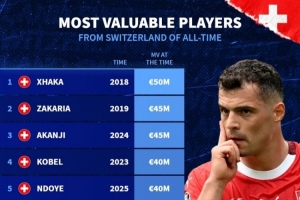 瑞士球員歷史最高身價(jià)排行:扎卡居首 扎卡里亞、阿坎吉并列第二