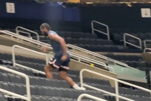 記者Noa Dalzell在賽前兩個多小時拍到了在球館內(nèi)跑臺階訓(xùn)練熱身的萊昂納德。