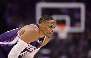 上半場比賽,威少攻防兩端依然拼盡全力,投籃手感不佳就沖筐造殺傷,防守端預(yù)判搶斷,就是失誤有些多。
