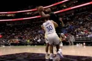 GIF-庫(kù)里頭上被肘到,但還是被改判防守犯規(guī)