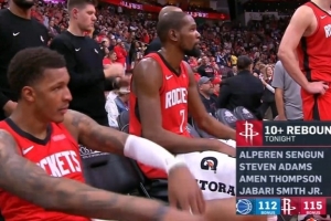本場比賽火箭四人籃板上雙,據(jù)現(xiàn)場統(tǒng)計,這是自隊史2001年來首次。