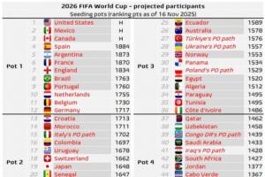體育資訊11月17日訊 世預賽激戰(zhàn)正酣,目前世界杯48支參賽隊已確定32席,數據機構Football Meets Data給出了最新的世界杯分檔預測。