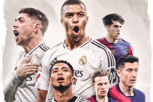 姆巴佩、貝林厄姆和巴爾韋德出鏡,巴薩球員中,也有萊萬、德容等人。海報上方為對陣雙方以及比賽性質(zhì)等信息,右下角為比賽體育場。