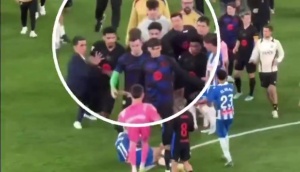 賽后巴薩在球場內(nèi)慶祝引發(fā)西班牙人球員不滿,巴爾德推倒西班牙人球員。隨后加維準備上前參與,被萊萬阻止。
