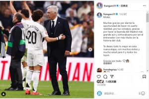 體育資訊5月24日訊 皇馬主帥安切洛蒂今夏離任,弗蘭-加西亞更新社媒動態(tài),與安帥告別。