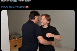 克羅地亞官推曬出莫德里奇與主帥的合照,并配文:“主教練擁抱隊(duì)長(zhǎng)?!?/p>