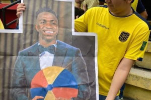 厄瓜多爾球迷舉起了沙灘球、還P了維尼修斯捧起沙灘球的圖嘲諷維尼修斯拿金球。