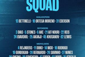 中場:4-賴因德斯、11-多庫、14-尼科-岡薩雷斯、16-羅德里、19-京多安、20-B席、26-薩維尼奧、27-努內(nèi)斯、29-切爾基、30-埃切維里、47-福登、52-鮑勃、75-奧賴利;