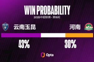 今晚20:00,河南隊(duì)將客場挑戰(zhàn)目前排名中超第8名的云南玉昆。根據(jù)OPTA預(yù)測,云南玉昆有43%幾率獲勝,而河南隊(duì)有30%幾率獲勝。