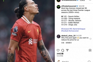 體育資訊6月27日訊 利物浦前鋒努涅斯今夏被推至轉(zhuǎn)會市場,這位烏拉圭前鋒曾在2022年頂著8500萬歐身價(jià)加盟紅軍。據(jù)WhoScored數(shù)據(jù)統(tǒng)計(jì),過去三個(gè)英超賽季中(出場時(shí)間超過3000分鐘),場均錯(cuò)失絕佳機(jī)會次數(shù)最多的球員中,努涅斯以1.02次居首,哈蘭德0.93次第二。