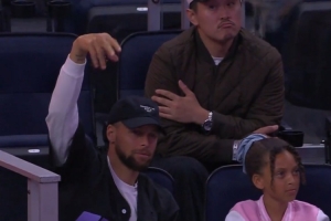 此役,勇士球星庫(kù)里攜二女兒萊恩現(xiàn)場(chǎng)觀(guān)戰(zhàn),并在鏡頭前互動(dòng)。