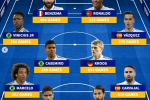 后衛(wèi):馬塞洛(252場(chǎng))、瓦拉內(nèi)(268場(chǎng))、拉莫斯(282場(chǎng))、卡瓦哈爾(325場(chǎng))