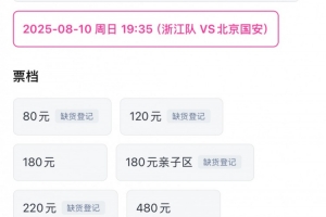 8月4日晚,浙江隊(duì)開售本周日主場迎戰(zhàn)北京國安的中超比賽門票,根據(jù)網(wǎng)絡(luò)售票界面顯示,開售半小時(shí)后,80元、120元價(jià)位的球票以及親子看臺(tái)球票均顯示售罄。其中,80元票檔的球票開售僅2分鐘便告售罄!目前,220元票檔也已售罄,只剩下180元和480元兩檔。